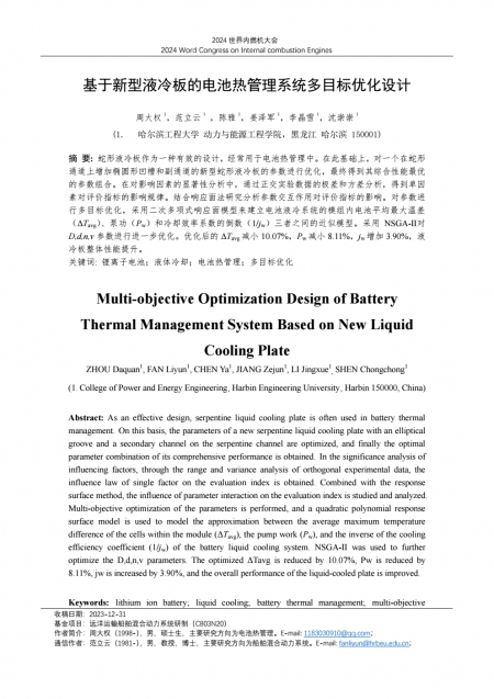 蛇形液冷板作为一种有效的设计,经常用于电池热管理中。在此基础上,对一个在蛇形通道上增加椭圆形凹槽和副通道的新型蛇形液冷板的参数进行优化,最终得到其综合性能最优的参数组合。在对影响因素的显著性分析中,通过正交实验数据的极差和方差分析,得到单因素对评价指标的影响规律。结合响应面法研究分析参数交互作用对评价指标的影响。对参数进行多目标优化,采用二次多项式响应面模型来建立电池液冷系统的模组内电池平均最大温差(ΔTavg)、泵功(Pw)和冷却效率系数的倒数(1/jw)三者之间的近似模型。采用NSGA-Ⅱ对D,d,n,v参数进行进一步优化。优化后的ΔTavg减小10.07%,Pw减小8.11%,jw增加3.90%,液冷板整体性能提升。