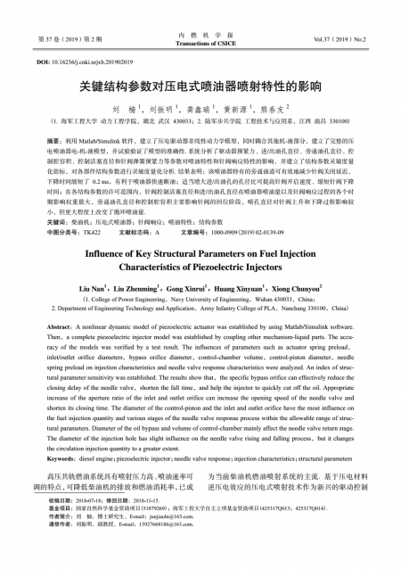 利用Matlab/Simulink 软件,建立了压电驱动器非线性动力学模型,同时耦合其他机-液部分,建立了完整的压电喷油器电-机-液模型,并试验验证了模型的准确性.系统分析了驱动器预紧力、进/出油孔直径、旁通油孔直径、控制腔容积、控制活塞直径和针阀弹簧预紧力等参数对喷油特性和针阀响应特性的影响,并建立了结构参数灵敏度量化指标,对各部件结构参数进行灵敏度量化分析.结果表明:该喷油器特有的旁通油道可有效地减少针阀关闭延迟,下降时间缩短了0.2 ms,有利于喷油器快速断油;适当增大进/出油孔的孔径比可提高针阀开启速度、缩短针阀下降时间;在各结构参数的许可范围内,针阀控制活塞直径和进/出油孔直径在喷油器喷油量以及针阀响应过程的各个时期影响权重最大,旁通油孔直径和控制腔容积主要影响针阀的回位阶段,喷孔直径对针阀上升和下降过程影响较小,但更大程度上改变了循环喷油量.